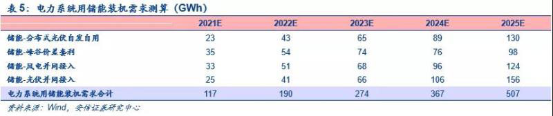 ■成長空間:發(fā)、用兩端齊頭并進(jìn),千億級別市場冉冉升起。在綜合考慮了發(fā)電側(cè)(平滑集中式光伏、風(fēng)電出力)以及用電側(cè)(分布式光伏自發(fā)自用、峰谷價差套利)等領(lǐng)域后,根據(jù)我們測算, 2021-2025年電力系統(tǒng)用儲能裝機(jī)需求分別為117、190、274、367和507GWh,需求年平均增速約為83.34%。