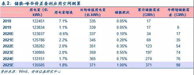 2)儲能配比假設(shè)遠(yuǎn)期目標(biāo)可以達(dá)到1%以上;根據(jù)上述假設(shè),2021-2025年上述峰谷價差套利對電化學(xué)儲能的累計需求將達(dá)到338GWh,2025年全球峰谷價差套利對電化學(xué)儲能的需求將達(dá)到98GWh。當(dāng)然,未來隨著儲能系統(tǒng)的進(jìn)一步普及,我們認(rèn)為上述5國以外的其他市場也會產(chǎn)生可觀的峰谷價差套利的儲能需求。按照用電量增速和用電量占比情況估值,我們判斷彼時該領(lǐng)域的全球需求有望在上述測算的基礎(chǔ)上翻倍。