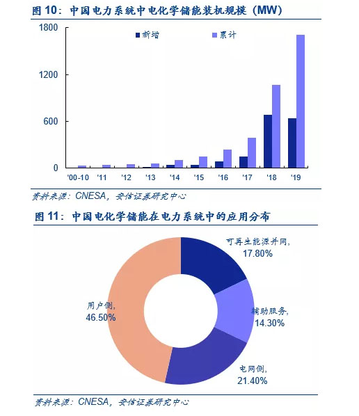 從應(yīng)用分布來看,用戶側(cè)電化學(xué)儲能是主要應(yīng)用領(lǐng)域,占比約46.5%。截至 2018 年,從中國累計投運(yùn)的電化學(xué)儲能項目的應(yīng)用分布上看,用戶側(cè)領(lǐng)域的裝機(jī)規(guī)模最大,為 470.4MW,占比 46.5%;電網(wǎng)側(cè)和集中式可再生能源并網(wǎng)分列二、三位,分別占比 21.4%和 17.8%。2018年,從中國新增投運(yùn)的電化學(xué)儲能項目的應(yīng)用分布上看,依然是用戶側(cè)領(lǐng)域的裝機(jī)規(guī)模最大,為 293.3MW,占比 42.9%,同比增長 312.5%,電網(wǎng)側(cè)、輔助服務(wù)和集中式可再生能源并網(wǎng)分列二至四位。