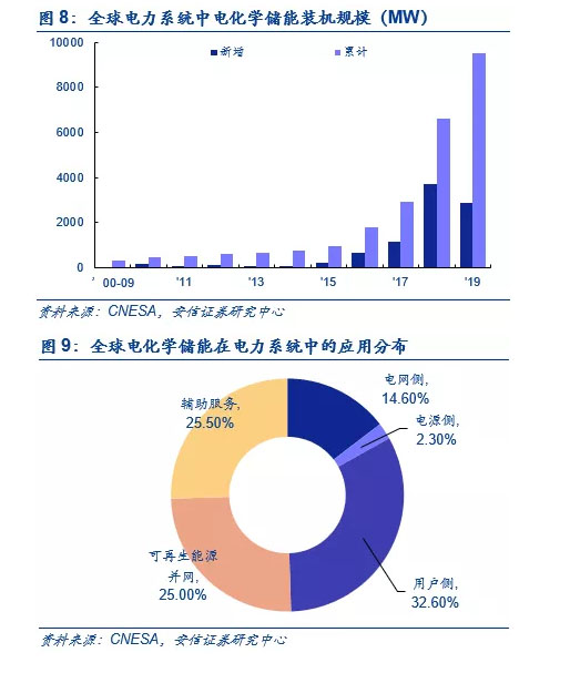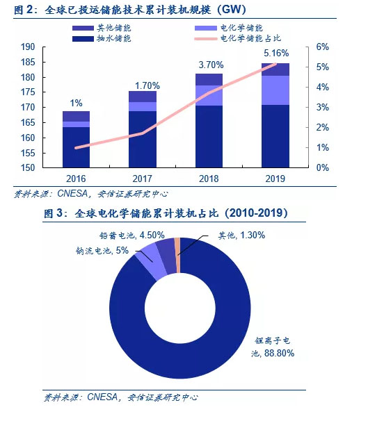 電化學(xué)儲能中最主要的是鋰離子電池儲能,目前占比約88.75%。到2019年底,全球已投運(yùn)儲能項目累計裝機(jī)規(guī)模184.6GW,其中電化學(xué)儲能項目約9.52GW,占比約5.4%。在電化學(xué)儲能中,鋰離子電池的累計裝機(jī)規(guī)模最大。根據(jù)CNESA統(tǒng)計數(shù)據(jù),2010-2019年累計的9.52GW電化學(xué)儲能項目中,鋰離子電池儲能項目為 8.45GW,占比 88.75%。鈉硫電池和鉛蓄電池的應(yīng)用規(guī)模相對較小,占比分別為 5.4%和 4.5%。