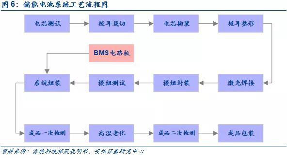 儲能電池系統(tǒng)由電芯和電池管理系統(tǒng)組成。儲能電池系統(tǒng)的生產(chǎn)工藝流程一般分為兩個工段。在電池模組生產(chǎn)工段,經(jīng)檢驗合格的電芯經(jīng)過極耳裁切、電芯插裝、極耳整形、激光焊接、模組封裝等工序組裝為電池模組;在系統(tǒng)組裝工段,經(jīng)檢驗合格的電池模組與 BMS 電路板等組裝成系統(tǒng)成品,然后經(jīng)一次檢測、高溫老化和二次檢測等工序后進(jìn)入成品包裝環(huán)節(jié)。