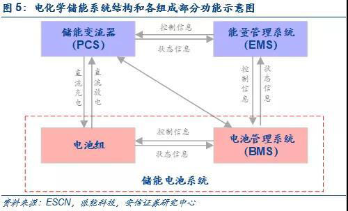 完整的電化學(xué)儲能系統(tǒng)主要由電池組、電池管理系統(tǒng)(BMS)、能量管理系統(tǒng)(EMS)、儲能變流器(PCS)以及其他電氣設(shè)備構(gòu)成。其中,電池組是儲能系統(tǒng)最主要的構(gòu)成部分;電池管理系統(tǒng)(BMS)主要負(fù)責(zé)電池的監(jiān)測、評估、保護(hù)以及均衡等;能量管理系統(tǒng)(EMS)負(fù)責(zé)數(shù)據(jù)采集、網(wǎng)絡(luò)監(jiān)控和能量調(diào)度等;儲能變流器可以控制儲能電池組的充電和放電過程,進(jìn)行交直流的變換。