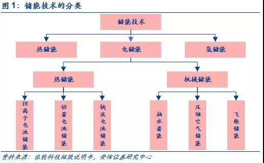 儲能即能量的存儲。根據(jù)能量存儲形式的不同,廣義儲能包括電儲能、熱儲能和氫儲能三類。電儲能是最主要的儲能方式,按照存儲原理的不同又分為電化學(xué)儲能和機(jī)械儲能兩種技術(shù)類型。其中,電化學(xué)儲能是指各種二次電池儲能,主要包括鋰離子電池、鉛蓄電池和鈉硫電池等;機(jī)械儲能主要包括抽水蓄能、壓縮空氣儲能和飛輪儲能等。