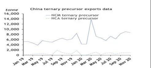 中國海關數(shù)據(jù)顯示,2020年1-11月國內NCM三元前驅體出口達81649噸,同比增長37.2%;同期NCA前驅體的出口量增長了1.4%,達到6868噸。