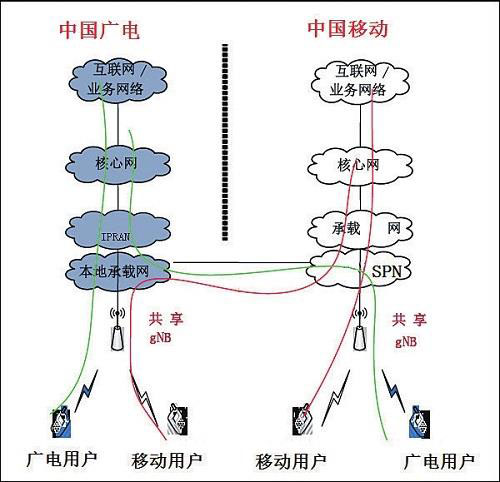 在承載網(wǎng)側(cè),固網(wǎng)資源豐富的區(qū)域以中國(guó)廣電自建為主,通過(guò)固移融合接入,雙方通過(guò)匯聚層/核心層對(duì)接;固網(wǎng)資源匱乏的區(qū)域以租用中國(guó)移動(dòng)承載網(wǎng)為主,接入移動(dòng)承載網(wǎng)。