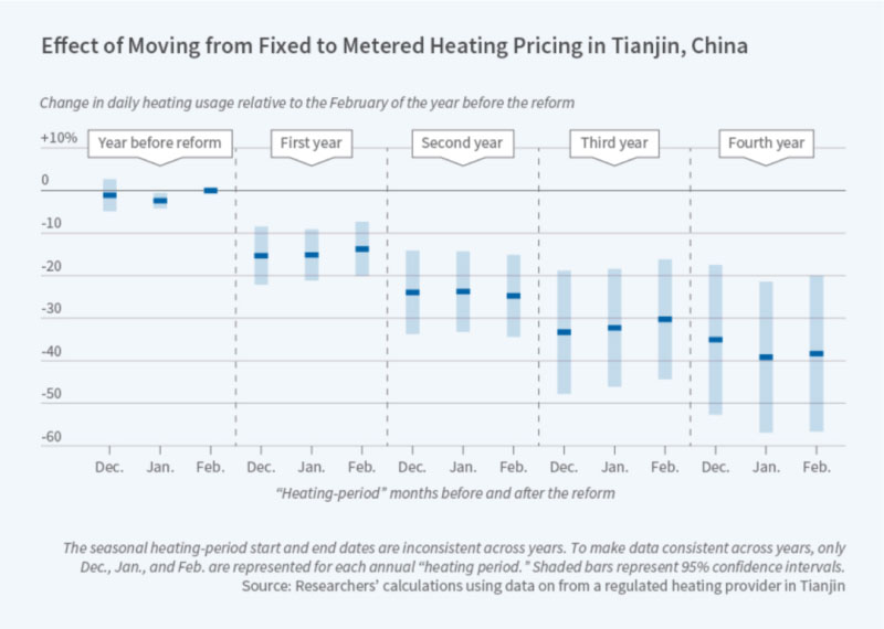 美國哈里斯公共政策研究所伊藤光一郎、科羅拉多大學(xué)博爾德分校的張爽(音譯)的研究發(fā)現(xiàn),如何對(duì)居民用能收費(fèi)會(huì)對(duì)社區(qū)的能源使用產(chǎn)生重大影響,并最終影響到空氣質(zhì)量。以中國天津?yàn)槔?,有關(guān)部門用以熱計(jì)量為基礎(chǔ)的系統(tǒng)取代了固定價(jià)格的供暖收費(fèi)系統(tǒng)。數(shù)據(jù)表明,安裝熱計(jì)量表四年后,供暖能耗下降了約三分之一。