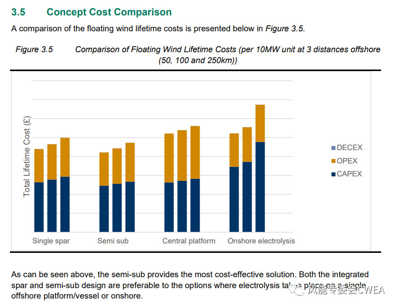 英國另一個名為dubbed Dolphyn 的氫能島項目,計劃使用漂浮式風電配合電解槽來進行制氫,分別采用一臺2MW和10MW的漂浮式風機。Dolphyn母公司ERM進行的一項分析顯示,四種不同裝置的全生命周期成本各不不同。