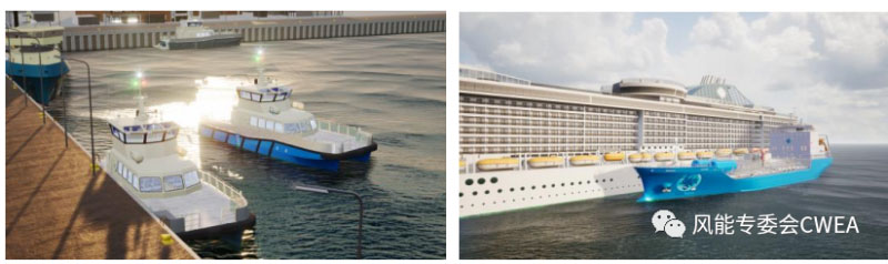 其中兩臺自帶電解槽的漂浮式風機,使用不同的漂浮式基礎,一個是單柱式漂浮式海上基礎,一個采用半潛式漂浮式基礎。第三個方案使用海上中央平臺制氫,第四個只是簡單地將電力輸送到岸上電解槽制氫。