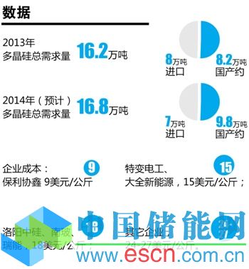 2013年國內(nèi)多晶硅產(chǎn)量約8.2萬噸,進口量8萬噸,總供應(yīng)量16.2萬噸。預(yù)計2014年多晶硅進口減少至7萬噸,國內(nèi)產(chǎn)量9.8萬噸,總供應(yīng)量16.8萬噸,整體供需平衡。