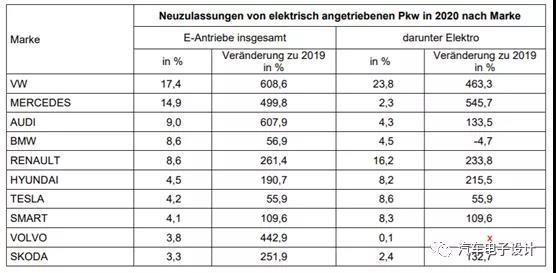 在所有的19.4萬純電動(dòng)汽車?yán)锩?,大眾品牌占比最高,在主場的市場占有率達(dá)到了23.8%,其次是雷諾(16.2%)和特斯拉(8.6%)。德國目前推廣了394,940臺純電,這里面可以看到BMW、AUDI和奔馳在2020年的純電動(dòng)率和歷史的存量來看是比較低的,今年隨著各種新產(chǎn)品的登陸,之前的Smart、I3和存量的車數(shù)據(jù)給拉低了不少。