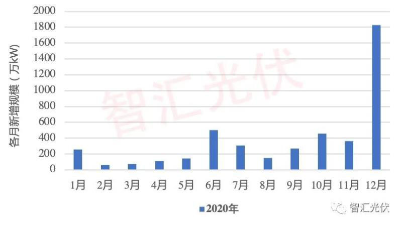2020年全年,光伏各月的新增裝機(jī)如下圖所示。根據(jù)國家能源局統(tǒng)計數(shù)據(jù),1~9月國內(nèi)新增光伏裝機(jī)18.7GW,而12月一個月,新增高達(dá)18.3GW??!