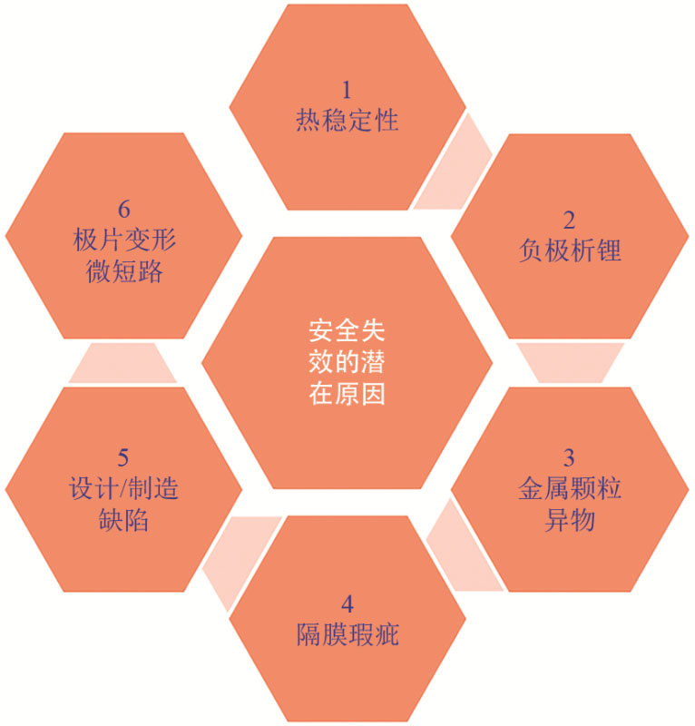 鋰離子電池發(fā)生安全事故的原因很多,且發(fā)生事故后電池被燒毀很難還原事故原因,因此只能根據(jù)推理找出鋰離子電池安全性失效的可能原因。如圖2所示,作者總結(jié)了6個(gè)方面的主要原因:熱穩(wěn)定性、負(fù)極析鋰、正極金屬異物、隔膜瑕疵、設(shè)計(jì)/制造缺陷和極片變形等。
