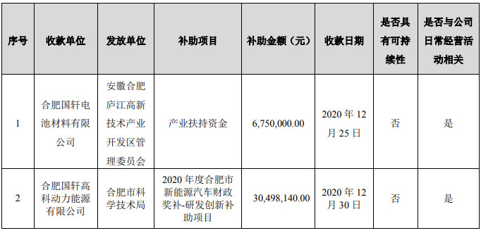 1月7日晚,國軒高科發(fā)布公告稱,公司子公司2020年10-12月份累計收到與收益相關(guān)政府補助資金合計人民幣4840.53萬元,具體如下: