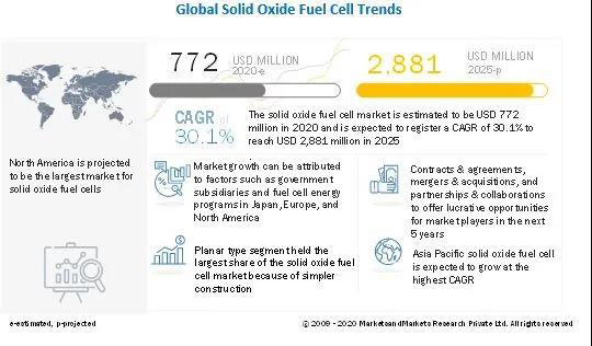 中國(guó)儲(chǔ)能網(wǎng)訊:根據(jù)國(guó)際市場(chǎng)研究機(jī)構(gòu)Markets and Markets日前發(fā)布的報(bào)告,預(yù)計(jì)全球固態(tài)氧化物燃料電池市場(chǎng)規(guī)模將從2020年的7.72億美元增長(zhǎng)至2025年的28.81億美元,復(fù)合年增長(zhǎng)率為30.1%。