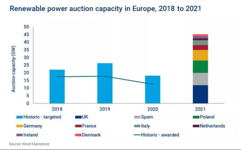 根據(jù)Wood Mackenzie最新的一項分析,2021年歐洲計劃競標(biāo)的總?cè)萘扛哌_(dá)45GW,其中包括17GW的風(fēng)電,6GW的光伏發(fā)電,以及技術(shù)中立的或多種可再生能源混合技術(shù)。