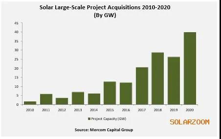 到2020年,有231個(gè)大型太陽(yáng)能項(xiàng)目并購(gòu)交易,而2019年為192筆交易。2020年,創(chuàng)紀(jì)錄的39.5吉瓦大型太陽(yáng)能項(xiàng)目易手,而2019年為26.1吉瓦。這是迄今為止單年度獲得的最大項(xiàng)目數(shù)量。