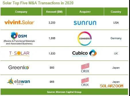 2020年,太陽(yáng)能領(lǐng)域完成了62項(xiàng)并購(gòu)交易,而2019年為65項(xiàng)。大多數(shù)交易涉及太陽(yáng)能下游企業(yè)。2020年最大的一筆交易是Sunrun以32億美元的全股票交易收購(gòu)了Vivint Solar。