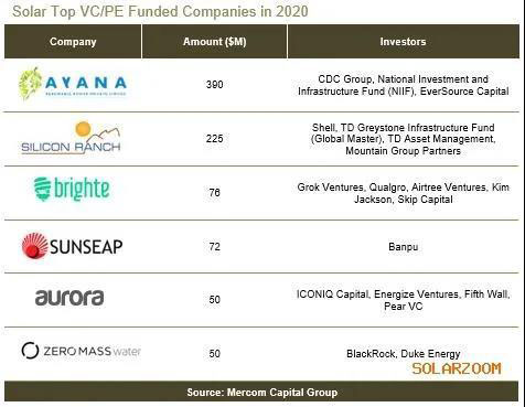2020年獲得風(fēng)險(xiǎn)投資最多的公司是Ayana Renewable Power,籌集了3.9億美元;Silicon Ranch Corporation,籌集了2.25億美元;Brighte籌集了7600萬(wàn)美元;Sunseap Group籌集了7200萬(wàn)美元;Aurora Solar和Zero Mass Water各自籌集了5,000萬(wàn)美元。