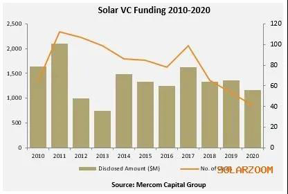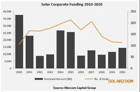 2020年,太陽(yáng)能行業(yè)的全球風(fēng)險(xiǎn)投資和私募股權(quán)(VC/PE)達(dá)到41筆交易,累計(jì)規(guī)模12億美元,而2019年的53筆交易為14億美元。