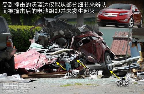 沃藍(lán)達(dá)被撞后已是面目全非,我們僅能通過中網(wǎng)、輪轂及大燈的細(xì)節(jié),來分辨出這是一輛雪佛蘭沃藍(lán)達(dá)。而事故中沃藍(lán)達(dá)的電池組卻并未發(fā)生起火和爆炸,這也與該車并未處于開啟狀態(tài)有關(guān)。VOLT沃蘭達(dá)的上一宗車禍?zhǔn)窃谛旭傊邪l(fā)生的,而那一次則發(fā)生了火災(zāi)。