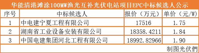 中國(guó)儲(chǔ)能網(wǎng)訊:近日,華能清港灘涂漁光互補(bǔ)光伏電站項(xiàng)目施工總承包預(yù)招標(biāo)中標(biāo)候選人公示,其中,中電建寧夏工程有限公司以報(bào)價(jià) 17516萬元,單價(jià)1.75元/瓦,位列第一中標(biāo)候選人。具體中標(biāo)情況如下: