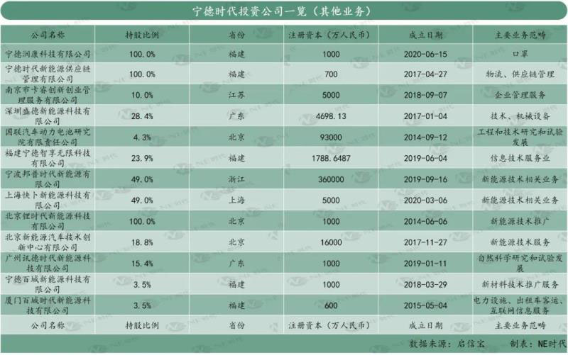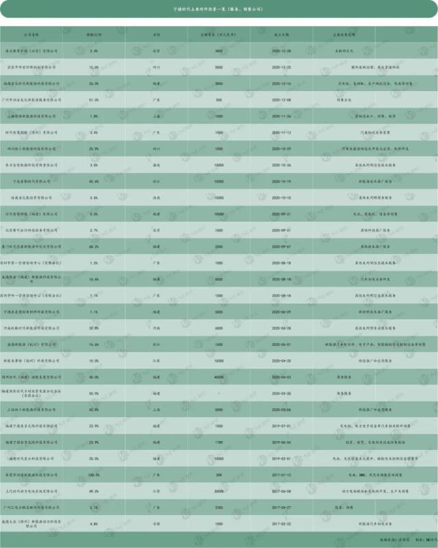 2020年有一個(gè)比較明顯的特征,寧德時(shí)代布局了多家投資企業(yè),包含電池資產(chǎn)投資、私募基金投資、創(chuàng)業(yè)企業(yè)以及股權(quán)、證券投資,這可能跟寧德時(shí)代擴(kuò)充產(chǎn)能有關(guān)。另外,2020年寧德時(shí)代控股和投資了23家服務(wù)和銷售公司,在擴(kuò)大銷售版圖的基礎(chǔ)上銷售產(chǎn)品包含充電樁、電池、設(shè)備、材料、儲(chǔ)能系統(tǒng)等等產(chǎn)品。