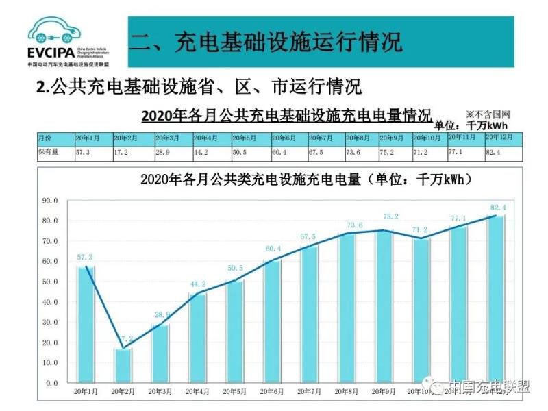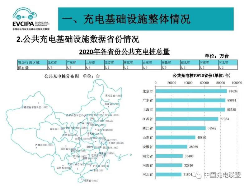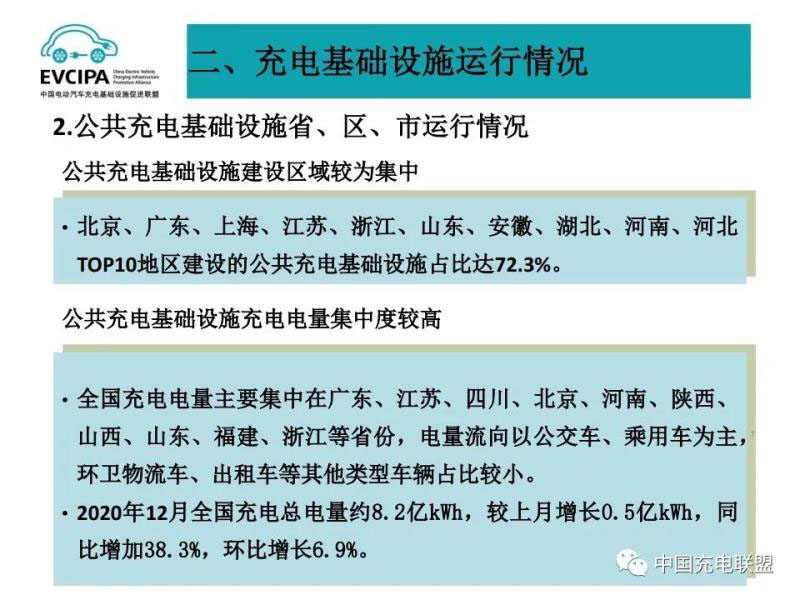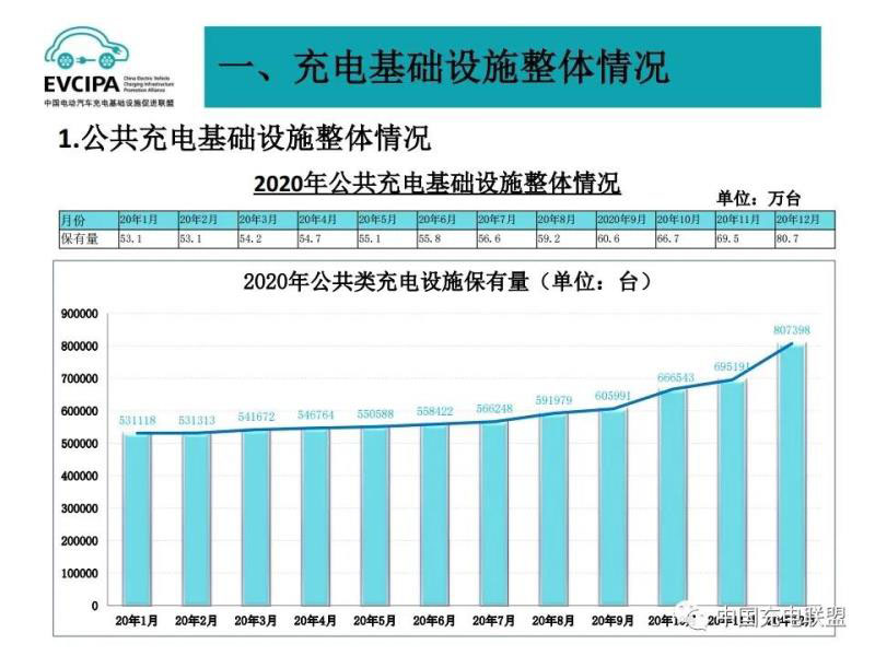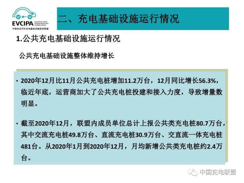 1、公共充電基礎(chǔ)設施運行情況,2020年12月比11月公共充電樁增加11.2萬臺,12月同比增長56.3%,臨近年底,運營商加大了公共充電樁投建和接入力度,導致增量數(shù)明顯。截至2020年12月,聯(lián)盟內(nèi)成員單位總計上報公共類充電樁80.7萬臺,其中交流充電樁49.8萬臺、直流充電樁30.9萬臺、交直流一體充電樁481臺。從2020年1月到2020年12月,月均新增公共類充電樁約2.4萬臺。