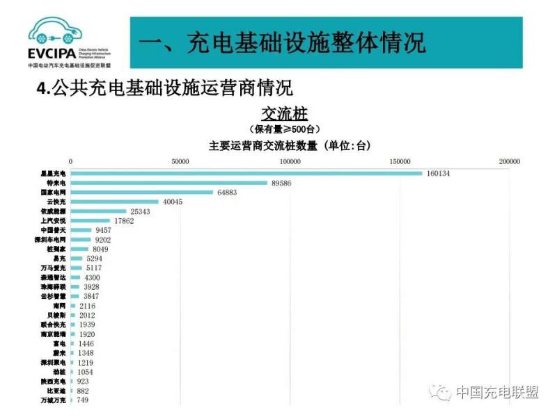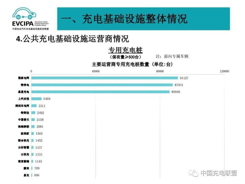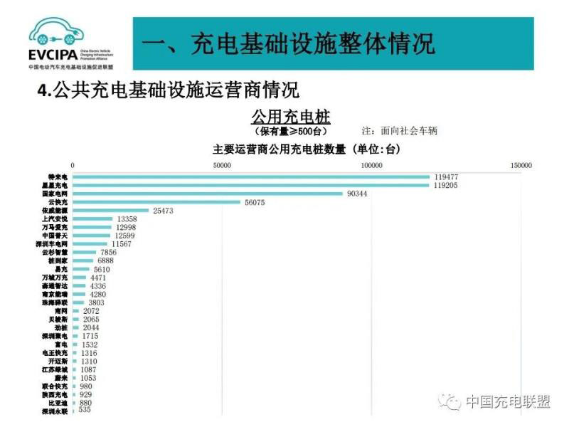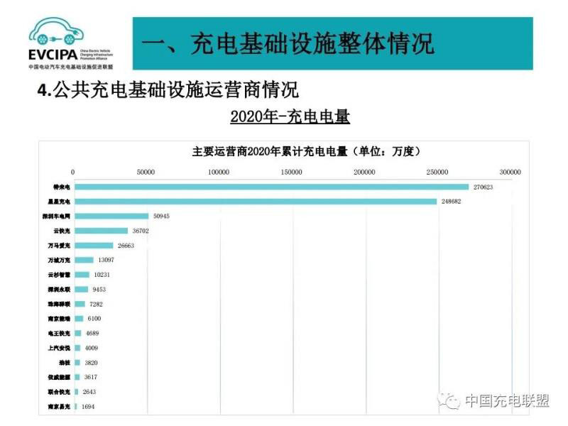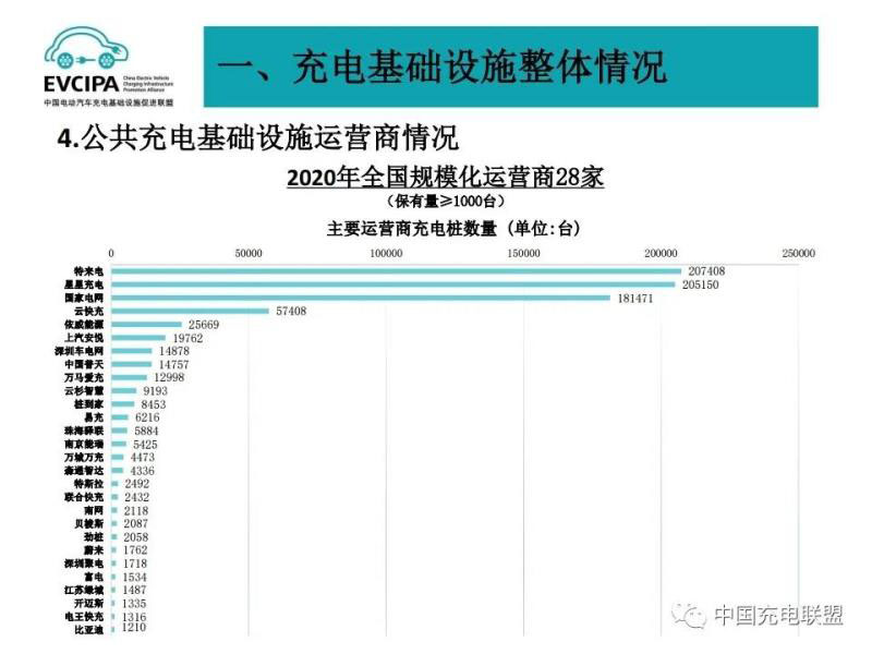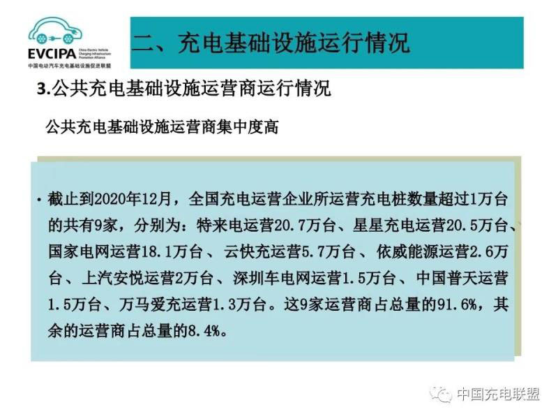 3、公共充電基礎(chǔ)設施運營商運行情況,截止到2020年12月,全國充電運營企業(yè)所運營充電樁數(shù)量超過1萬臺的共有9家,分別為:特來電運營20.7萬臺、星星充電運營20.5萬臺、國家電網(wǎng)運營18.1萬臺、云快充運營5.7萬臺、依威能源運營2.6萬臺、上汽安悅運營2萬臺、深圳車電網(wǎng)運營1.5萬臺、中國普天運營1.5萬臺、萬馬愛充運營1.3萬臺。這9家運營商占總量的91.6%,其余的運營商占總量的8.4%。