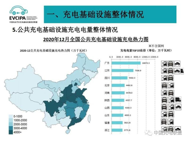 2、公共充電基礎(chǔ)設施省、區(qū)、市運行情況,北京、廣東、上海、江蘇、浙江、山東、安徽、湖北、河南、河北TOP10地區(qū)建設的公共充電基礎(chǔ)設施占比達72.3%。全國充電電量主要集中在廣東、江蘇、四川、北京、河南、陜西、山西、山東、福建、浙江等省份,電量流向以公交車、乘用車為主,環(huán)衛(wèi)物流車、出租車等其他類型車輛占比較小。2020年12月全國充電總電量約8.2億kWh,較上月增長0.5億kWh,同比增加38.3%,環(huán)比增長6.9%。