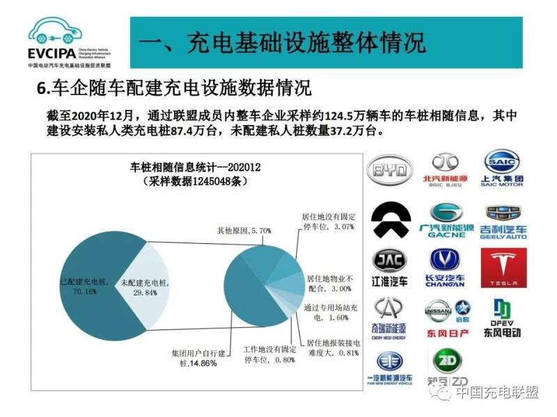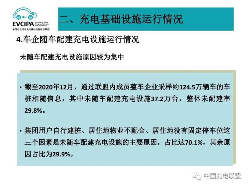 4、車企隨車配建充電設施運行情況,截至2020年12月,通過聯(lián)盟內(nèi)成員整車企業(yè)采樣約124.5萬輛車的車樁相隨信息,其中未隨車配建充電設施37.2萬臺,整體未配建率29.8%。集團用戶自行建樁、居住地物業(yè)不配合、居住地沒有固定停車位這三個因素是未隨車配建充電設施的主要原因,占比達70.1%,其余原因占比為29.9%。