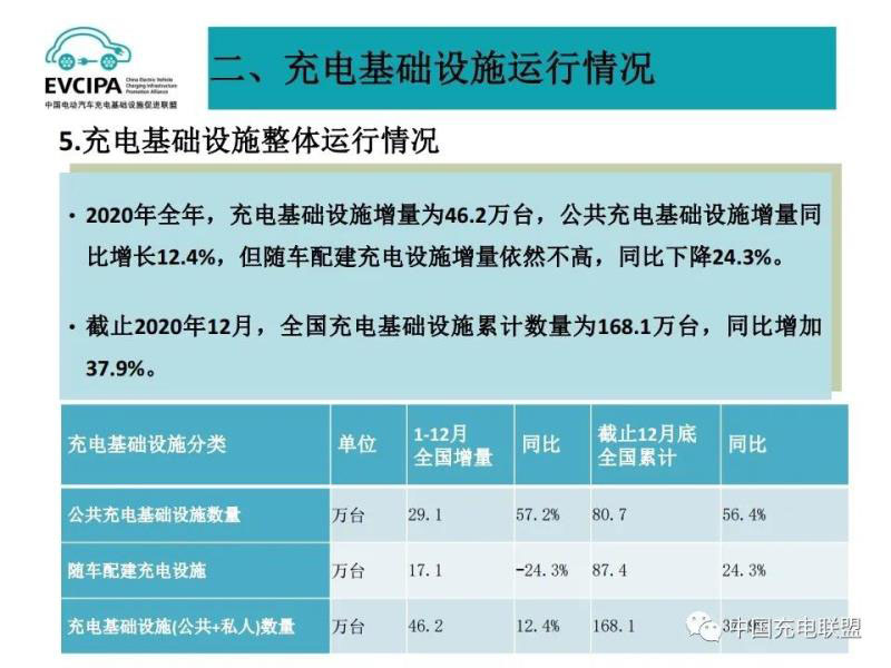 5、充電基礎(chǔ)設施整體運行情況,2020年全年,充電基礎(chǔ)設施增量為46.2萬臺,公共充電基礎(chǔ)設施增量同比增長12.4%,但隨車配建充電設施增量依然不高,同比下降24.3%。截止2020年12月,全國充電基礎(chǔ)設施累計數(shù)量為168.1萬臺,同比增加37.9%。