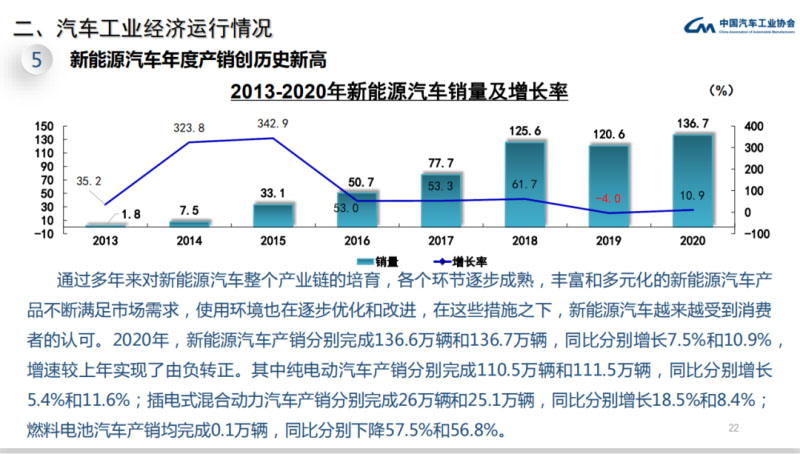 中國(guó)儲(chǔ)能網(wǎng)訊:1月13日下午,《新能源汽車報(bào)》記者從中國(guó)汽車工業(yè)協(xié)會(huì)獲悉,2020年汽車產(chǎn)銷形勢(shì)總體保持穩(wěn)定,產(chǎn)量環(huán)比略有下降,銷量小幅增長(zhǎng)。其中,新能源汽車逆勢(shì)增長(zhǎng),銷售136.7萬(wàn)輛,同比增長(zhǎng)10.9%,創(chuàng)歷史新高。