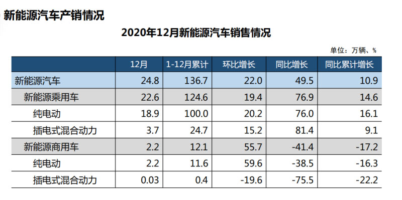 其中,在新能源汽車方面,12月新能源汽車產(chǎn)銷繼續(xù)保持快速增長(zhǎng),產(chǎn)銷雙雙超過(guò)20萬(wàn)輛,再創(chuàng)歷史新高。分別達(dá)到23.5萬(wàn)輛和24.8萬(wàn)輛,環(huán)比增長(zhǎng)17.3%和22.0%,同比增長(zhǎng)55.7%和49.5%。