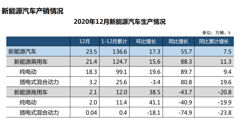 2020年,新能源汽車產(chǎn)銷136.6萬(wàn)輛和136.7萬(wàn)輛,同比增長(zhǎng)7.5%和10.9%。在新能源汽車主要品種中,與上年相比,純電動(dòng)汽車和插電式混合動(dòng)力汽車產(chǎn)銷均呈增長(zhǎng),表現(xiàn)均明顯好于上年。
