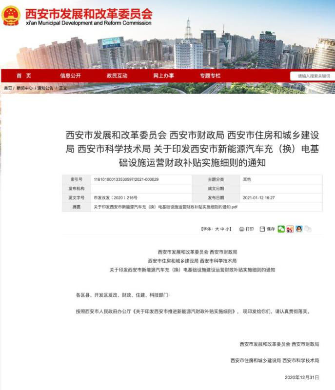 中國儲(chǔ)能網(wǎng)訊:日前,我們從西安市發(fā)展和改革委員會(huì)官網(wǎng)處了解到,其于1月12日發(fā)布了《新能源汽車充(換)電基礎(chǔ)設(shè)施運(yùn)營(yíng)財(cái)政補(bǔ)貼實(shí)施細(xì)則的通知》,其中包含對(duì)在我市新購新能源汽車,且在自有車位上新建固定充電樁的個(gè)人,給予一次性財(cái)政補(bǔ)貼;對(duì)在本細(xì)則執(zhí)行有效期內(nèi)建設(shè)完成并通過驗(yàn)收的個(gè)人自用充電設(shè)施,由市財(cái)政給予10000元/根一次性建設(shè)及電費(fèi)補(bǔ)貼等。具體如下: