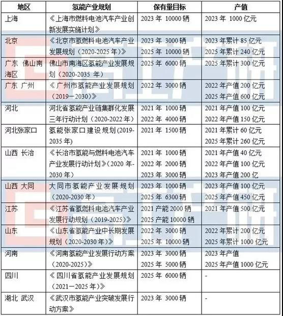 另據(jù)不完全統(tǒng)計,僅上海、北京、廣東、山西、山東、江蘇、河北、河南、四川、湖北等十個省份及直轄市明確規(guī)劃(如下圖所示),2023/2025年燃料電池汽車保有量分別達(dá)到3.5萬輛和7.63萬輛。2020年底國內(nèi)燃料電池汽車保有量在8000輛左右,這意味著未來三年年均銷量需達(dá)到9000輛以上,未來五年年均銷量在13660輛以上。