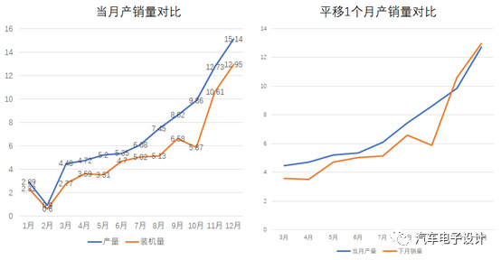 圖3 中國(guó)動(dòng)力電池的產(chǎn)銷(xiāo)量對(duì)比和平移的效果