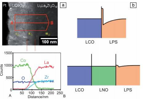 在全固態(tài)鋰離子電池中,當(dāng)過渡金屬氧化物作正極、硫化物作電解質(zhì)時,由于鋰離子在氧化物中的電勢比在硫化物中的高,所以鋰離子在電場力的驅(qū)動下從硫化物電解質(zhì)遷移到氧化物正極材料中,直至界面兩端電勢平衡。但當(dāng)達(dá)到平衡后,硫化物電解質(zhì)與氧化物正極材料的界面處會形成一個類似電子導(dǎo)體中PN結(jié)的低鋰離子濃度區(qū)域,該區(qū)域被稱為空間電荷層。由于空間電荷層的鋰離子濃度較低,所以該區(qū)域的離子電導(dǎo)率較低,從而導(dǎo)致離子在該區(qū)域的遷移勢壘較高,造成該區(qū)域的阻抗急劇增大。如圖 1b所示,通過在LCO表面包覆LNO可以有效抑制空間電荷層的形成。Yamamoto等利用電子全息照相對LCO和LPS之間的界面進行表征,證實了在該界面靠近LPS側(cè)存在因鋰離子重新排布形成的低離子濃度區(qū)域,即空間電荷層。盡管研究人員意識到了空間電荷層的存在,也證實了空間電荷層是導(dǎo)致基于硫化物固態(tài)電解質(zhì)的全固態(tài)鋰離子電池阻抗過大的主要原因,但是對于空間電荷層的化學(xué)形成過程的機理依然認(rèn)識不清。同時,由于外加電勢差的作用,界面處空間電荷層的化學(xué)行為更加復(fù)雜。