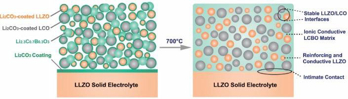在正極材料中混入低熔點離子導(dǎo)體,通過施加高于 離子導(dǎo)體熔點的溫度使離子導(dǎo)體融化后冷卻,均勻分布在正極材料與固態(tài)電解質(zhì)之間,這種方法不僅可以避免正極材料與固態(tài)電解質(zhì)接觸發(fā)生反應(yīng)。而且可以提高正極材料與固態(tài)電解質(zhì)之間的接觸面積, 還能改善因正極顆粒在充放電時發(fā)生破碎而導(dǎo)致的接觸不良的問題。Han等在LCO和 LLZO界面處加入低熔點的LCBO,如圖6所示。LCBO使LCO與固態(tài)電解質(zhì)的接觸面積增大,同時減小了LCO在充放電過程中因體積變化導(dǎo)致的顆粒破碎對正極材料與導(dǎo)電劑之間接觸性能的影響。另外,利用LCBO隔絕LCO與LLZO,避免了兩者之間在充放電過程中發(fā)生反應(yīng)。3方面共同作用,提升了LCO/LLZO/Li全固態(tài)鋰離子電池的電化學(xué)性能,然而,該方法的制備工藝非常復(fù)雜,成本較高。