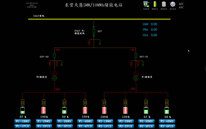 山東東營天慧漁光互補光伏項目位于山東省東營市墾利區(qū)境內,地勢平坦開闊,光照資源豐富,交通便利,是良好的光伏發(fā)電選址。項目總裝機規(guī)模達49MW,建成后年發(fā)電量將達6600萬度,年節(jié)約煤炭消費2.65萬噸。長園深瑞提供的5MW/10MWh預制艙式儲能系統(tǒng)由8臺PRS-7563 630kW儲能變流器經(jīng)過一體式升壓艙接入35kV母線,每臺儲能變流器對下接1.25MWh儲能電池。儲能監(jiān)控系統(tǒng)由長園深瑞PRS-3000儲能能量管理系統(tǒng)(EMS)和PRS-3201B儲能協(xié)調控制器組成。該5MW/10MWh預制艙式儲能系統(tǒng)采用PCS協(xié)調統(tǒng)一控制架構,采用“集中監(jiān)控+PCS協(xié)調控制“的模式,實現(xiàn)全站PCS功率快速協(xié)調控制、一次調頻、AGC跟蹤、AVC控制及發(fā)電功率平滑等功能,并納入山東省電網(wǎng)統(tǒng)一調度。