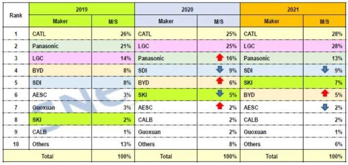 2019-2021年全球動(dòng)力電池裝機(jī)份額及預(yù)測(cè)