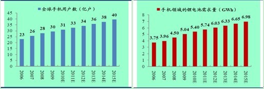 圖2 全球手機(jī)用戶數(shù)帶動(dòng)鋰離子電池需求增長(zhǎng)情況