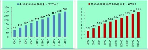圖3 全球筆記本需求增長(zhǎng)帶動(dòng)鋰離子電池需求增長(zhǎng)情況