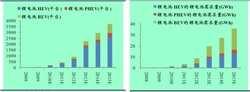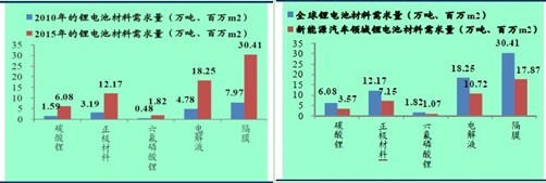 圖7 2010年、2015年電池材料的需求量預(yù)測(cè)(左),2015年新能源汽車鋰電池材料需求量(右)