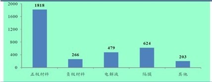 從電池人才網(wǎng)的統(tǒng)計(jì)數(shù)據(jù)可知,在2009年全球鋰離子電池材料銷售值較2008年增長(zhǎng)了16%,達(dá)到了33.9億美元。其中正極材料達(dá)18.1億美元,負(fù)極材料達(dá)2.66億美元,電解液達(dá)4.79億美元,隔膜達(dá)6.24億美元(圖8)。這表明正極材料的產(chǎn)業(yè)規(guī)模是電池材料中規(guī)模最大的一部分,因此鋰離子電池產(chǎn)業(yè)的發(fā)展將受制于正極材料產(chǎn)業(yè)的發(fā)展速度。