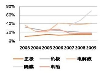 另外,各組成部分的投資回報(bào)率也高低不一,其中正極材料的投資回報(bào)率最低,維持在17%的水平,而隔膜制造的投資回報(bào)率最高,將近70%。這表明正極材料的市場(chǎng)競(jìng)爭(zhēng)最大,因此大力改善產(chǎn)業(yè)化技術(shù),降低生產(chǎn)成本是正極材料發(fā)展的必然選擇,而隔膜領(lǐng)域受到技術(shù)難題的約束使得隔膜企業(yè)競(jìng)爭(zhēng)力相對(duì)較小,毛利率較高,且在近幾年呈現(xiàn)逐年上升的趨勢(shì)(圖9)。
