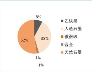 市場(chǎng)上主要的負(fù)極材料包括乙炔黑、人造石墨、碳微珠、合金和天然石墨,其中以天然石墨和人工石墨的市場(chǎng)占有率最高,分別為52%和38%(圖13)。