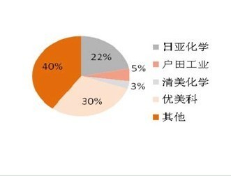 根據(jù)2009年統(tǒng)計(jì)數(shù)據(jù)(圖11)顯示,全球市場(chǎng)份額領(lǐng)先企業(yè)主要有比利時(shí)優(yōu)美科、日本日亞化學(xué)和日本戶田工業(yè),其市場(chǎng)占有率分別為30%、22%和5%。
