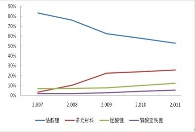 圖10 各類正極材料市場(chǎng)占有變化情況(2007-2011年)