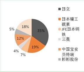 目前在國(guó)內(nèi),負(fù)極材料領(lǐng)先企業(yè)主要包括深圳貝特瑞、上海杉杉和長(zhǎng)沙海容。而在全球范圍內(nèi),負(fù)極材料的市場(chǎng)份額主要集中在日本日立、日本精工碳素、JFE日本鋼鐵、三菱、中國(guó)寶安-貝特瑞、杉杉股份6大廠家。圖14為六大負(fù)極材料廠商的市場(chǎng)份額占比。